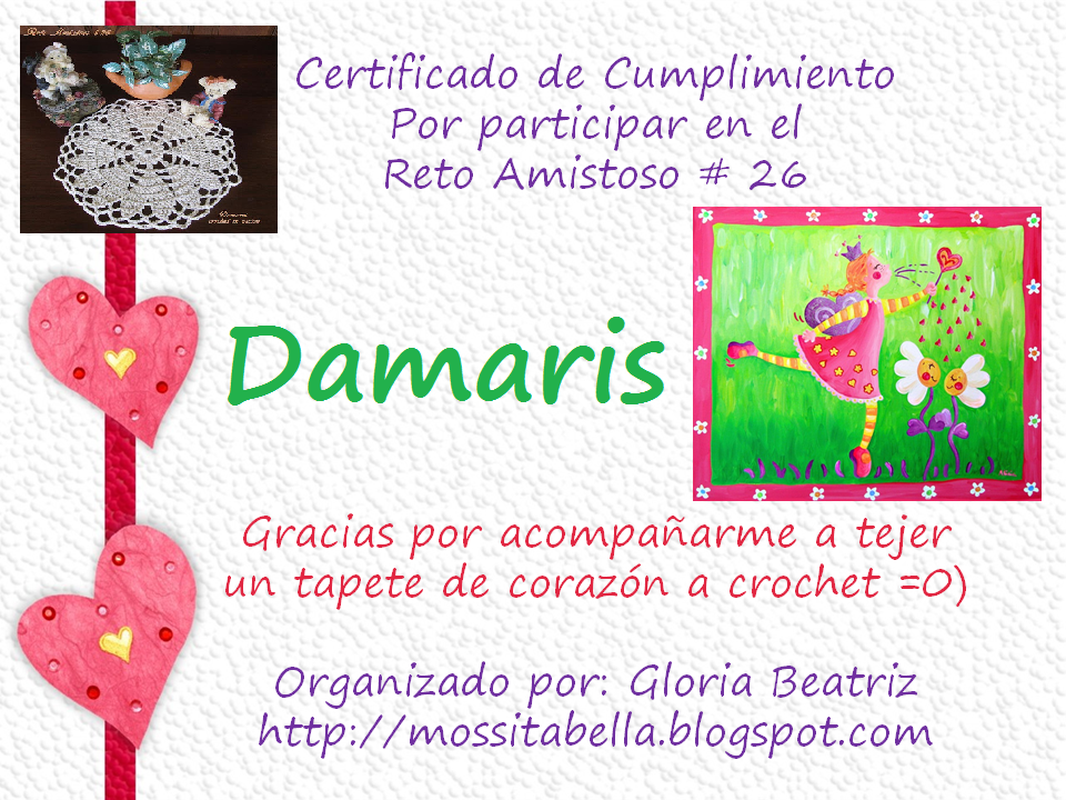 Muchas gracias Gloria Beatriz por la invitación y por ser organizadora. Fue agradable tejer la carpetita. Poco a poco ire visitanto las casitas. ¡Feliz día de cumplimiento de Reto Amistoso a todas las amigas participantes!